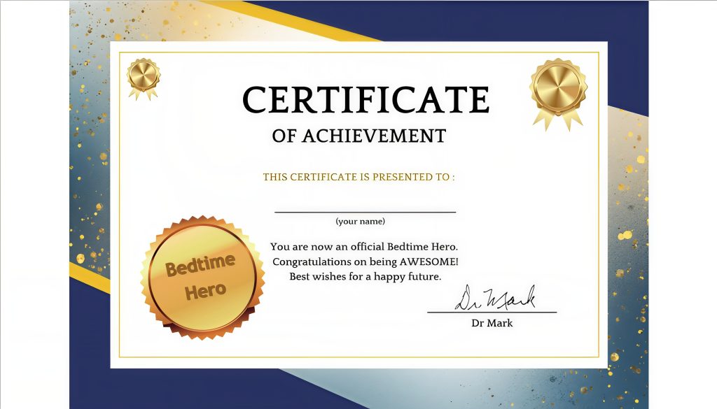 Here is your Bedtime Hero certificate and medal. Way to go!! To download these images on a computer, just right click and Save Image As... Then you can print them from your computer if you wish.